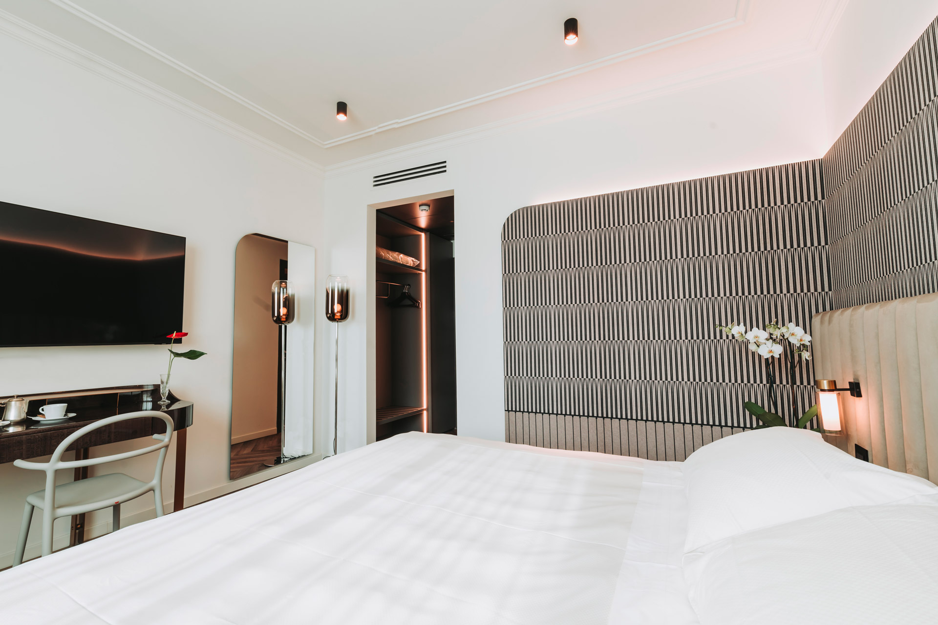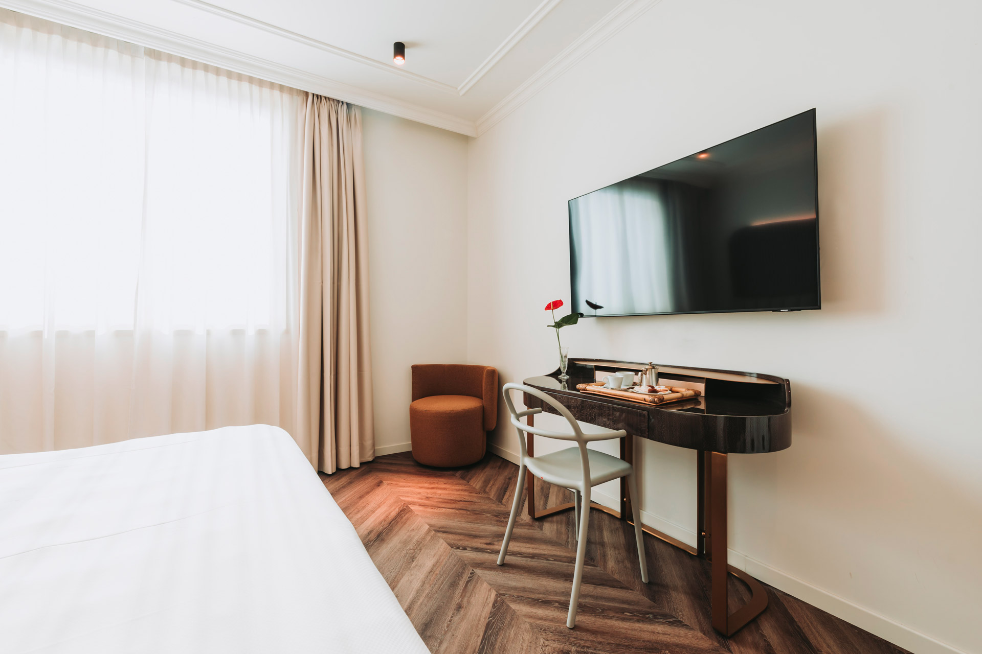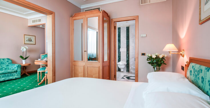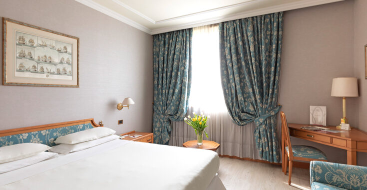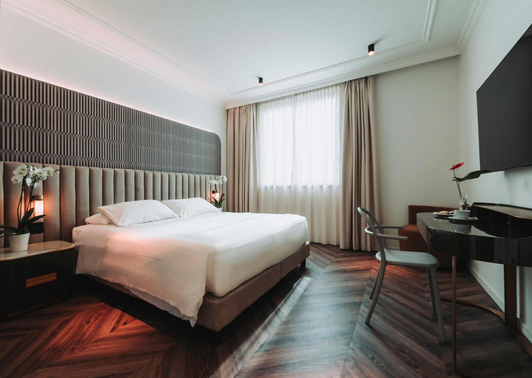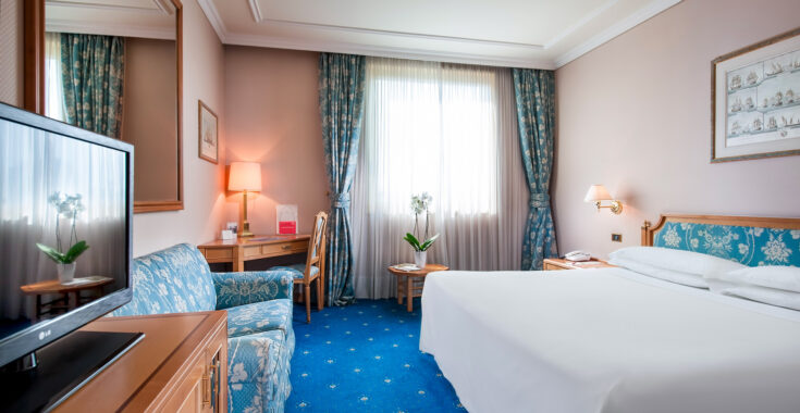 Prenota ora La nuova camera Executive, completamente rinnovata, ha una superficie di 23mq, letto matrimoniale o due letti singoli, una comoda poltroncina, un desk moderno con sedia, grande TV a muro con programmi Sat e Sky, connessione Wi-Fi, telefono, Mini-Bar e Cassaforte.