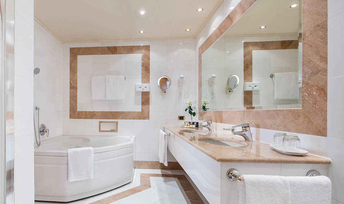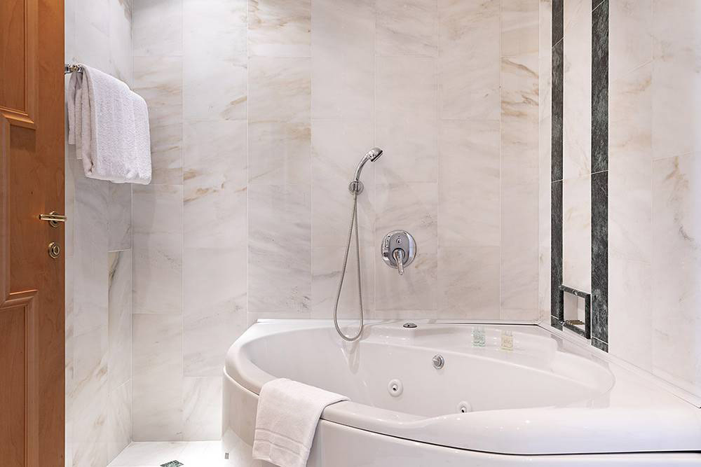 Il bagno in marmo è dotato di vasca idromassaggio, asciugacapelli, telefono, ciabattine, accappatoio e kit cortesia.