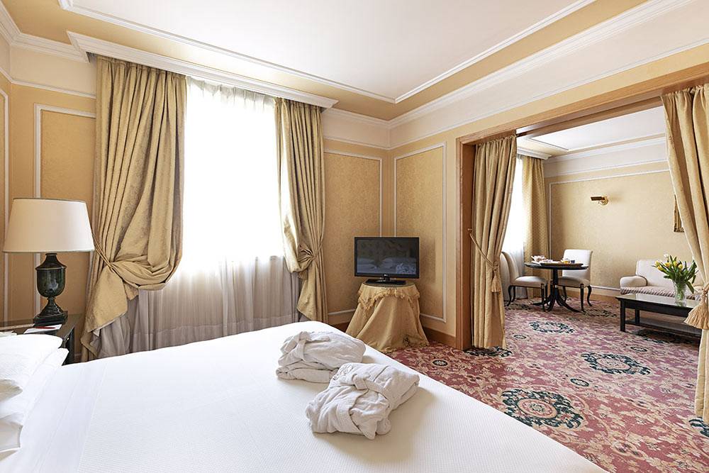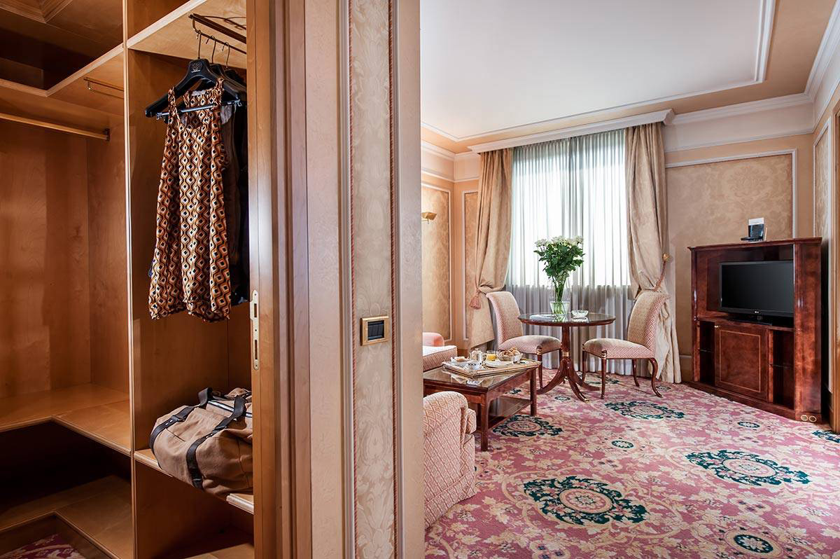 L’area soggiorno è arredata con scrivania, divano con tavolino e 2 sedie, TV con canali Sat e Sky, Wi-Fi Internet Gratuito, Mini-Bar e Cassaforte.