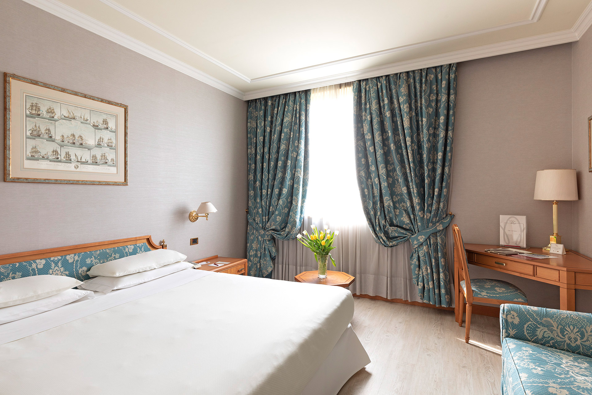 Prenota ora La camera Superior ha una superficie di 23mq, letto matrimoniale o due letti singoli, comodo divano con tavolino d’appoggio, TV con canali Sat e Sky, telefono, connessione Wi-Fi , Mini-Bar e Cassaforte.