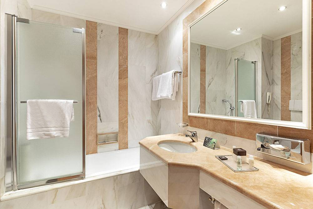 Bagno in marmo con vasca, asciugacapelli, telefono e kit cortesia.